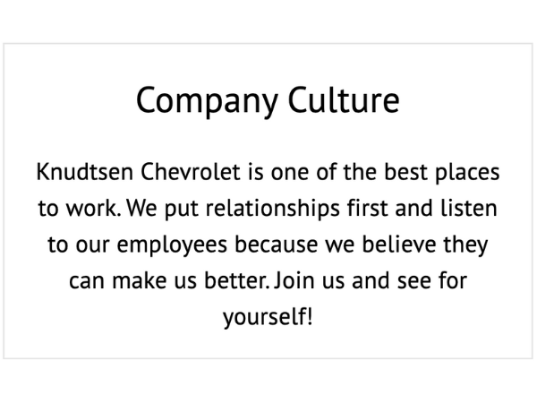 Join Knudtsen Auto Group, a thriving family-owned Chevrolet, Mazda and Lincoln dealership! Just minutes from Coeur d'Alene and a short drive from Spokane, access to year-round recreational activities in our backyard. With over 70 + years of growth, we're passionate about building lasting relationships, starting with our dedicated team. At Knudtsen, our number one value is our relationship – including relationships with our employees. Over the years, we’ve learned how invaluable it is to have the right person in the right position and then to do everything we can to keep them with us. That’s why we offer unique benefits and pride ourselves on our culture which only a family-owned business can provide. We offer departmental career paths, training, and professional development to help our team members grow and be prepared for whatever opportunity comes next! We're not just a business; we're a supportive community invested in your success!